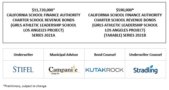 SUPPLEMENT TO PRELIMINARY LIMITED OFFERING MEMORANDUM relating to $11,720,000* CALIFORNIA SCHOOL FINANCE AUTHORITY CHARTER SCHOOL REVENUE BONDS (GIRLS ATHLETIC LEADERSHIP SCHOOL LOS ANGELES PROJECT) SERIES 2021A $590,000* CALIFORNIA SCHOOL FINANCE AUTHORITY CHARTER SCHOOL REVENUE BONDS (GIRLS ATHLETIC LEADERSHIP SCHOOL LOS ANGELES PROJECT) (TAXABLE) SERIES 2021B SUPPLEMENT TO PLOM POSTED 9-20-21
