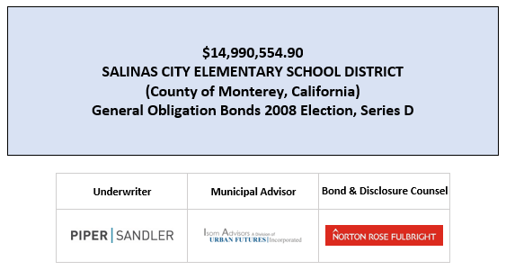 $14,990,554.90 SALINAS CITY ELEMENTARY SCHOOL DISTRICT (County of Monterey, California) General Obligation Bonds 2008 Election, Series D FOS POSTED 6-17-20 by AVIA Communications, Inc. | Jun 17, 2020 | Recent Deals | 0 comments