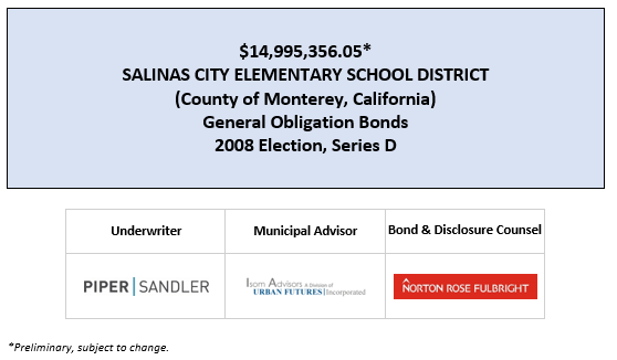 $14,995,356.05* SALINAS CITY ELEMENTARY SCHOOL DISTRICT (County of Monterey, California) General Obligation Bonds 2008 Election, Series D POS POSTED 5-20-20 by AVIA Communications, Inc. | May 20, 2020 | Recent Deals | 0 comments