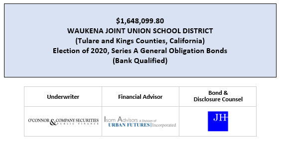 $1,648,099.80 WAUKENA JOINT UNION SCHOOL DISTRICT (Tulare and Kings Counties, California) Election of 2020, Series A General Obligation Bonds (Bank Qualified) FOS POSTED 6-23-20 by AVIA Communications, Inc. | Jun 23, 2020 | Recent Deals | 0 comments