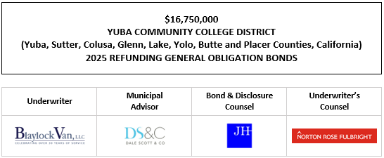 $16,750,000 YUBA COMMUNITY COLLEGE DISTRICT (Yuba, Sutter, Colusa, Glenn, Lake, Yolo, Butte and Placer Counties, California) 2025 REFUNDING GENERAL OBLIGATION BONDS FOS POSTED 8-6-25