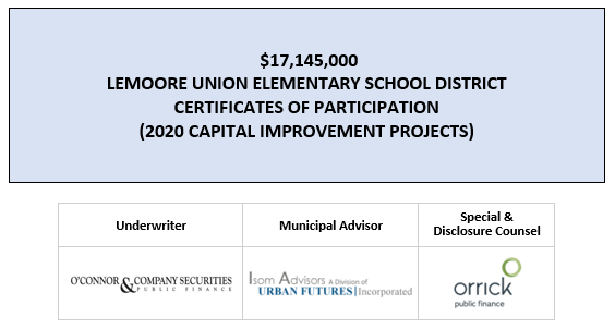 $17,145,000 LEMOORE UNION ELEMENTARY SCHOOL DISTRICT CERTIFICATES OF PARTICIPATION (2020 CAPITAL IMPROVEMENT PROJECTS) FOS POSTED 5-15-20 by AVIA Communications, Inc. | May 15, 2020 | Recent Deals | 0 comments