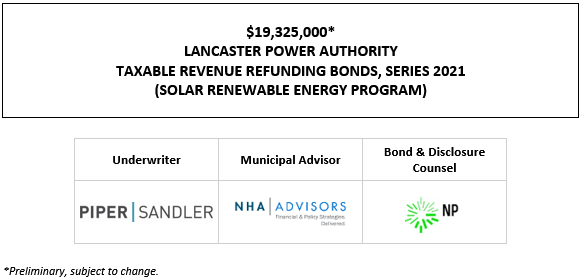 $19,325,000* LANCASTER POWER AUTHORITY TAXABLE REVENUE REFUNDING BONDS, SERIES 2021 (SOLAR RENEWABLE ENERGY PROGRAM) POS POSTED 9-16-21 by AVIA Communications, Inc. | Sep 16, 2021 | Recent Deals | 0 comments
