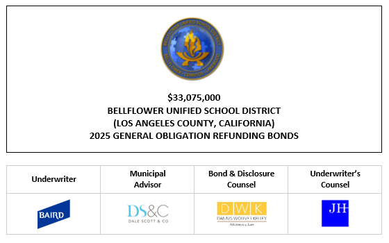 $33,075,000 BELLFLOWER UNIFIED SCHOOL DISTRICT (LOS ANGELES COUNTY, CALIFORNIA) 2025 GENERAL OBLIGATION REFUNDING BONDS FOS POSTED 12-2-25 by AVIA Communications, Inc. | Dec 2, 2025 | Recent Deals | 0 comments