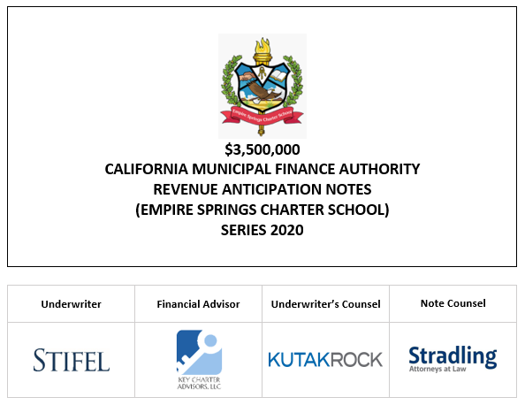 $3,500,000 CALIFORNIA MUNICIPAL FINANCE AUTHORITY REVENUE ANTICIPATION NOTES (EMPIRE SPRINGS CHARTER SCHOOL) SERIES 2020 Interest Rate: 4.000% Yield: 3.000%† CUSIP No.: 13048VPU6‡ LOM POSTED 6-22-20