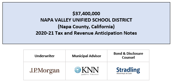 $37,400,000 NAPA VALLEY UNIFIED SCHOOL DISTRICT (Napa County, California) 2020-21 Tax and Revenue Anticipation Notes FOS POSTED 6-30-20 by AVIA Communications, Inc. | Jun 30, 2020 | Recent Deals | 0 comments