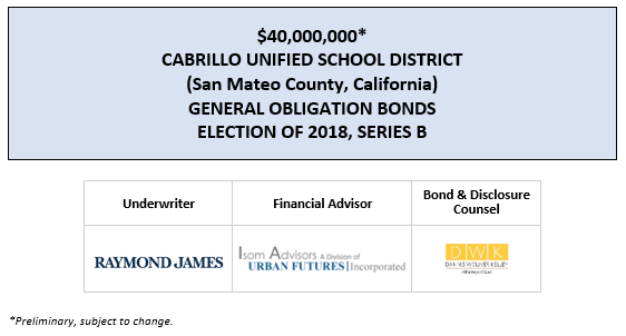 $40,000,000* CABRILLO UNIFIED SCHOOL DISTRICT (San Mateo County, California) GENERAL OBLIGATION BONDS ELECTION OF 2018, SERIES B POS POSTED 5-29-20 by AVIA Communications, Inc. | May 29, 2020 | Recent Deals | 0 comments
