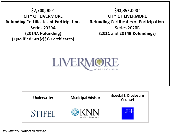 $7,700,000* CITY OF LIVERMORE Refunding Certificates of Participation, Series 2020A (2014A Refunding) (Qualified 501(c)(3) Certificates) $43,355,000* CITY OF LIVERMORE Refunding Certificates of Participation, Series 2020B (2011 and 2014B Refundings) POS POSTED 6-1-20