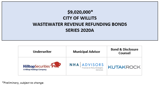 $9,020,000* CITY OF WILLITS WASTEWATER REVENUE REFUNDING BONDS SERIES 2020A POS POSTED 7-8-20 by AVIA Communications, Inc. | Jul 8, 2020 | Recent Deals | 0 comments