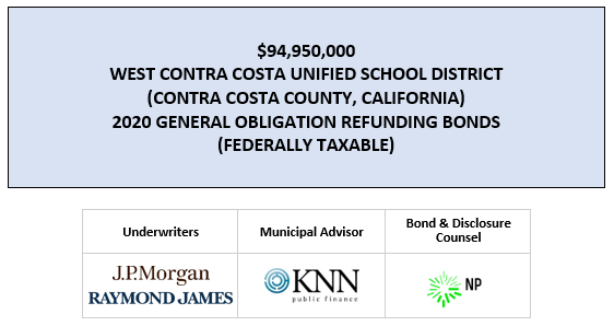 $94,950,000 WEST CONTRA COSTA UNIFIED SCHOOL DISTRICT (CONTRA COSTA COUNTY, CALIFORNIA) 2020 GENERAL OBLIGATION REFUNDING BONDS (FEDERALLY TAXABLE) FOS POSTED 5-7-20 by AVIA Communications, Inc. | May 7, 2020 | Recent Deals | 0 comments